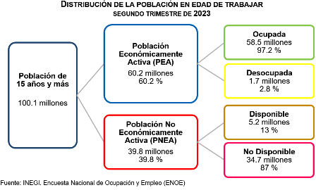 En el segundo trimestre de 2023, la Población Económicamente Activa (PEA) del país fue de 60.2 millones de personas, 878 mil más que en el segundo trimestre de 2022. La PEA representó 60.2 % de la población de 15 años y más.