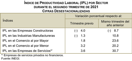 Por sector de actividad y con series desestacionalizadas, durante el segundo trimestre de 2021 la Productividad Laboral con base en las horas trabajadas en las empresas constructoras registró una caída de 4% y en los establecimientos manufactureros de 1.3% con relación al trimestre inmediato anterior. En las empresas de servicios privados no financieros la Productividad Laboral creció 3.6%, en las de comercio al por menor 3.2% y en las empresas de comercio al por mayor subió 1.8% en el trimestre en cuestión.