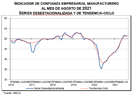 En su comparación anual, el Indicador de Confianza Empresarial por sector de actividad mostró el siguiente comportamiento: el ICE del Comercio creció 12.5 puntos, el de las Manufacturas 12.3 puntos y el de la Construcción aumentó 8 puntos durante agosto de 2021.