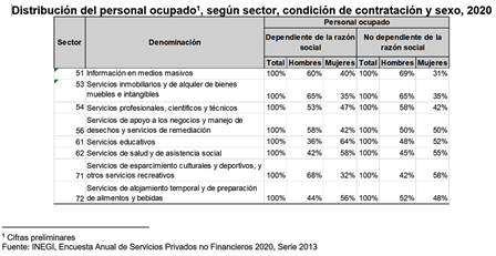 En cuanto a personal ocupado dependiente de la razón social, destaca la participación de las mujeres en los servicios educativos con 64% y en los servicios de salud y de asistencia social con un 58 por ciento.