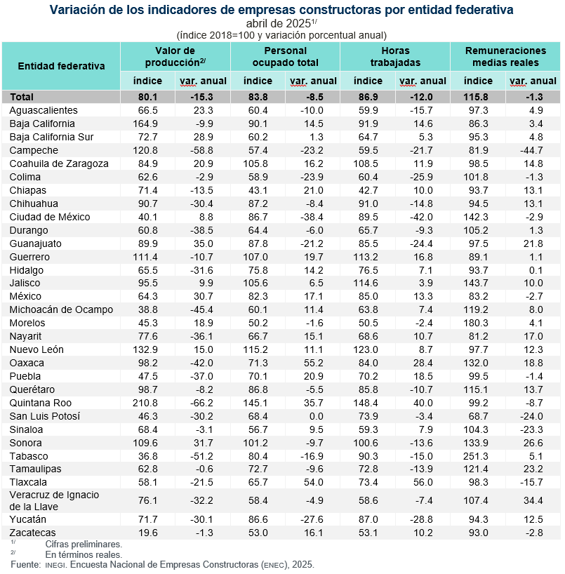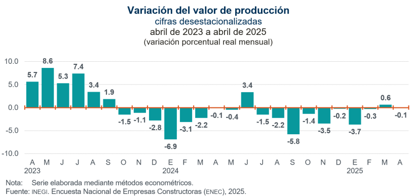 En abril de 2025 y con datos desestacionalizados, el valor de producción del sector Construcción decreció, en términos reales, 0.1 % a tasa mensual y 14.4 %, a tasa anual.