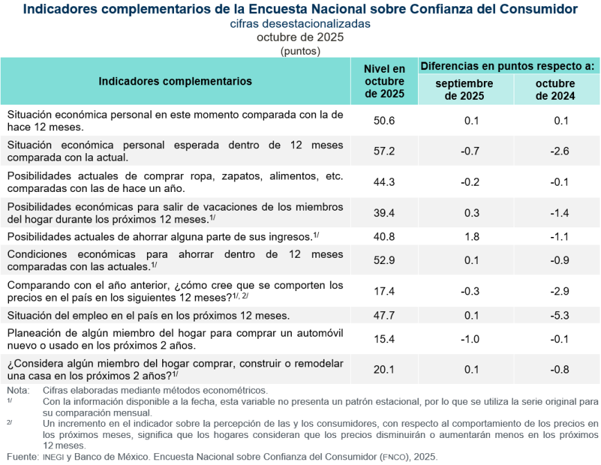 A continuación, se presentan los 10 indicadores complementarios sobre la confianza del consumidor que recaba la ENCO.