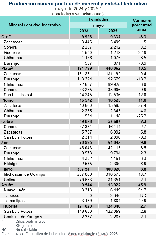 La producción minera (la que refiere únicamente a las actividades de extracción y beneficio de minerales metálicos y no metálicos) presentó, en mayo de 2025, los siguientes resultados: