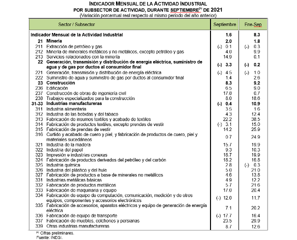 El INEGI informa que el Indicador Mensual de la Actividad Industrial (IMAI) disminuyó 1.4% en términos reales en el noveno mes de 2021 respecto al mes previo, con base en cifras desestacionalizadas