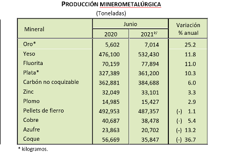 La producción minerometalúrgica creció 6.5% durante el sexto mes del año en curso con relación a la de junio de 2020; a su interior, avanzó la producción de oro, yeso, fluorita, plata, carbón no coquizable, zinc y la de plomo. En contraste, se redujo la de coque, azufre, cobre y la de pellets de fierro.