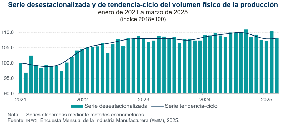En marzo de 2025 y con cifras desestacionalizadas, el volumen físico de la producción de la industria manufacturera presentó un decremento de 2.0 % en su comparación mensual y de 1.5 % a tasa anual.