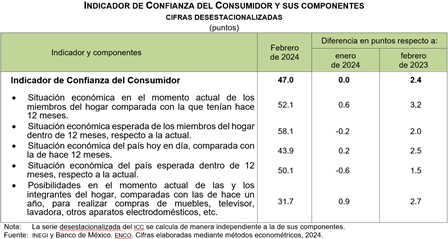 En febrero de 2024 y con datos ajustados por estacionalidad, el Indicador de Confianza del Consumidor (ICC) se ubicó en 47 puntos, mismo nivel que el reportado el mes previo.