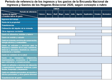Inicialmente, la ENIGH E fue planeada para levantarse durante todo 2020. Sin embargo, a consecuencia de la pandemia originada por la COVID-19, la captación de información fue suspendida en abril de 2020, por lo que la oferta de información que aquí se presenta corresponde al primer trimestre de 2020.