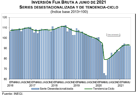 La Inversión Fija Bruta, que representa los gastos realizados en Construcción y en Maquinaria y Equipo de origen nacional e importado registró una disminución en términos reales de 1.8% durante junio de 2021 respecto al mes inmediato anterior, con cifras desestacionalizadas.