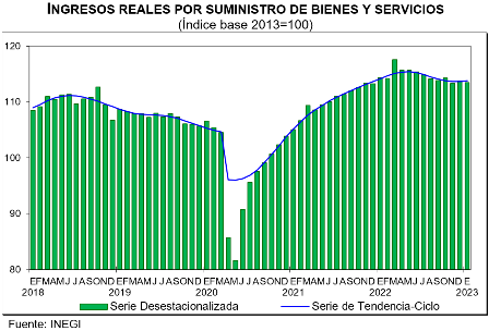 inegi bienes 2303En enero de 2023, a tasa mensual y con cifras desestacionalizadas, los resultados de la Encuesta Mensual sobre Empresas Comerciales (EMEC) indican que, en las empresas comerciales al por mayor, los ingresos reales por suministro de bienes y servicios disminuyeron 0.3 por ciento –monto que obtuvieron las empresas por todas aquellas actividades de producción, comercialización o prestación de servicios que realizaron en el mes de referencia-. Las remuneraciones medias reales pagadas aumentaron 0.9 % y el personal ocupado total no presentó variación.