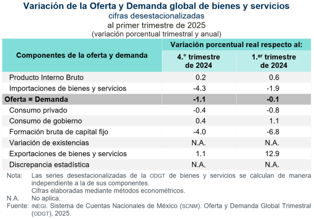 En su comparación anual, la Oferta global disminuyó 0.1 % en el primer trimestre de 2025: el PIB subió 0.6 % y las Importaciones de bienes y servicios descendieron 1.9 por ciento.