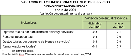 En enero de 2024 y con datos ajustados por estacionalidad, los ingresos totales reales por suministro de bienes y servicios, de los servicios privados no financieros, disminuyeron 0.3 % y las remuneraciones totales reales, 0.1 por ciento. El personal ocupado total incrementó 0.3 % y los gastos totales por consumo de bienes y servicios aumentaron 0.9 % respecto a diciembre pasado.
