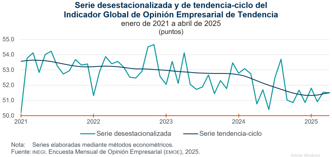 En abril de 2025 y con cifras desestacionalizadas, el IGOET —que es el promedio ponderado de los indicadores de los cuatro sectores que lo integran— fue de 51.5 puntos y representó una baja de 0.1 puntos en relación con el mes anterior. En su comparación anual aumentó 0.7 puntos. Con esta última observación, el indicador suma 59 meses seguidos por encima del umbral de los 50 puntos.