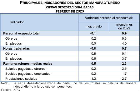 En febrero de 2023 y con datos ajustados por estacionalidad, los resultados de la Encuesta Mensual de la Industria Manufacturera (EMIM) muestran que el personal ocupado total del sector manufacturero disminuyó 0.1 % a tasa mensual.