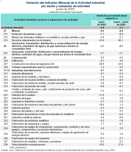 En su comparación anual, en junio de 2025, Minería disminuyó 8.5 % y Generación, transmisión, distribución y comercialización de energía eléctrica, suministro de agua y de gas natural por ductos al consumidor final, 3.8 por ciento. Industrias manufactureras se mantuvieron sin variación y Construcción creció 1.5 %.