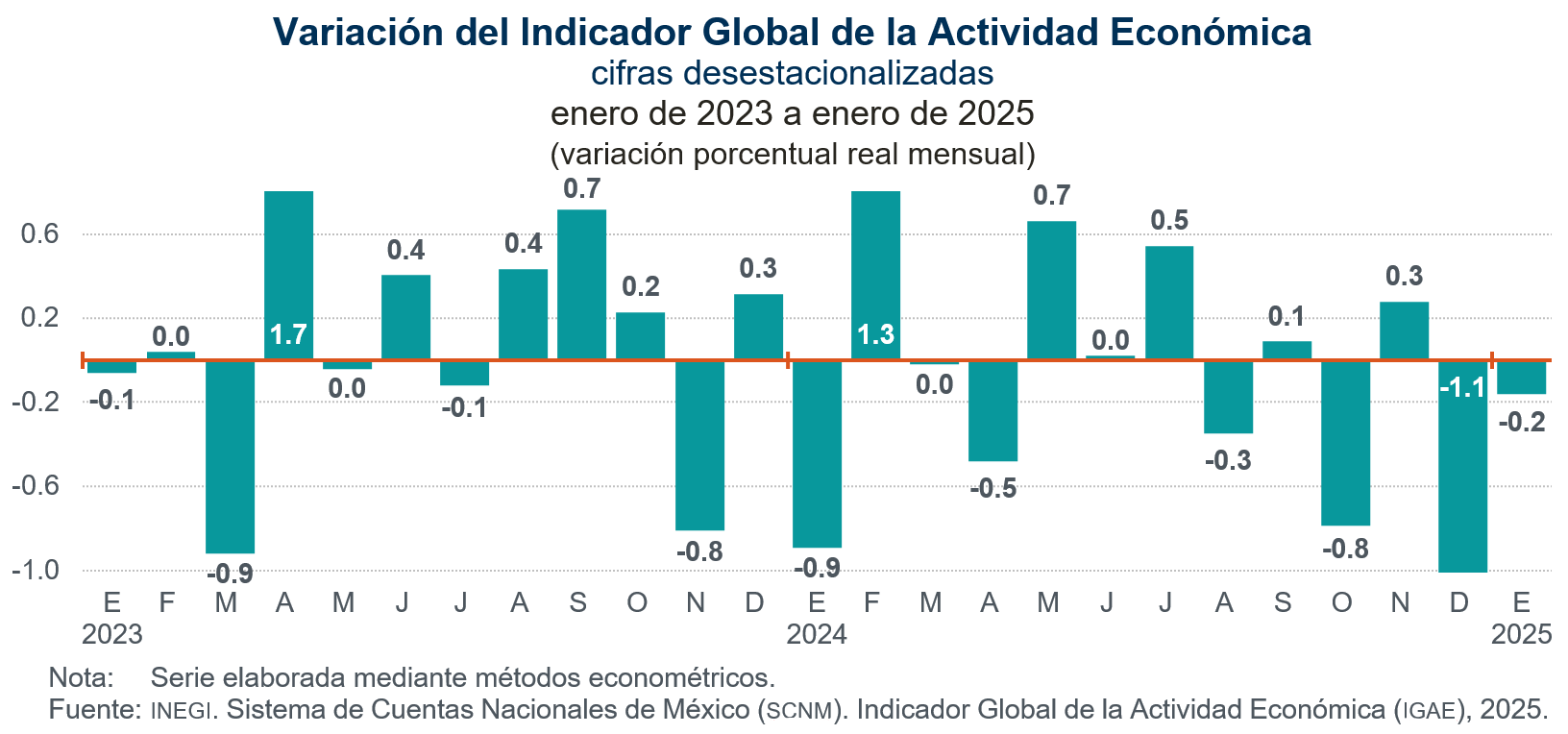 En enero de 2025 y con cifras desestacionalizadas, el IGAE cayó 0.2 % respecto a diciembre pasado, en términos reales. A tasa anual no presentó variación.