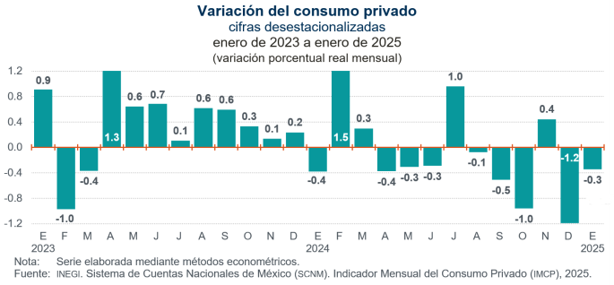 Disminuyó 0.3 % el consumo privado, en enero de 2025