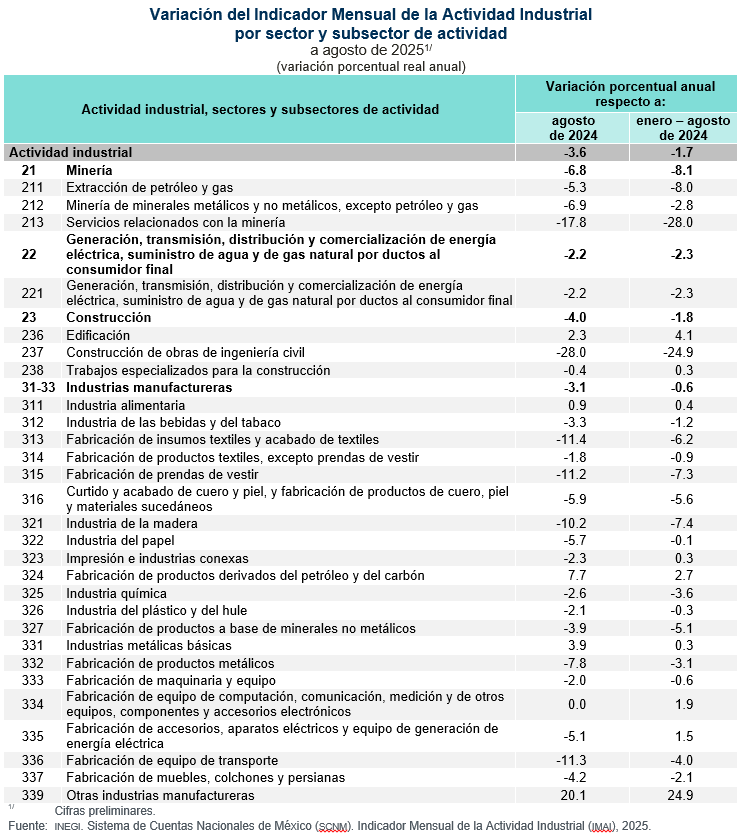 En su comparación anual, en agosto de 2025, Minería descendió 7.0 %; Construcción, 3.2 %; Generación, transmisión, distribución y comercialización de energía eléctrica, suministro de agua y de gas natural por ductos al consumidor final, 2.4 %, e Industrias manufactureras, 1.7 %.