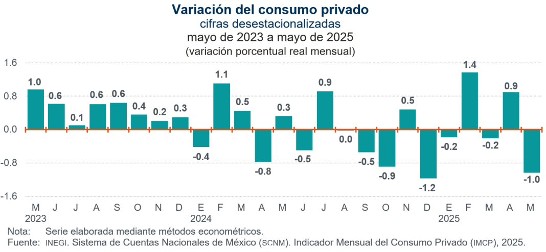 En mayo de 2025 y con cifras desestacionalizadas, el IMCP cayó 1.0 % respecto al mes previo, en términos reales. A tasa anual, retrocedió 0.9 por ciento.