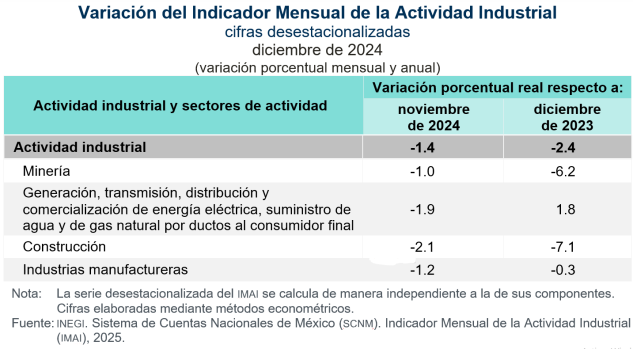 En su comparación anual, en diciembre de 2024, Construcción cayó 7.1 %; Minería, 6.2 % e Industrias manufactureras, 0.3 por ciento. Generación, transmisión, distribución y comercialización de energía eléctrica, suministro de agua y de gas natural por ductos al consumidor final avanzó 1.8 %.