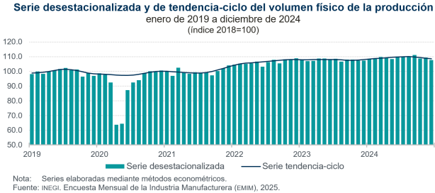 En diciembre de 2024 y con cifras desestacionalizadas, el volumen físico de la producción de la industria manufacturera presentó un descenso de 1.5 % en su comparación mensual y un alza de 0.2 % a tasa anual.