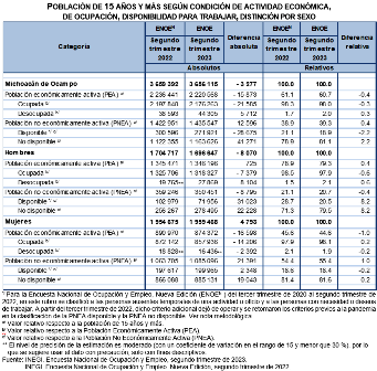 En el segundo trimestre de 2023, la Población Económicamente Activa (PEA) del estado de Michoacán de Ocampo, es decir, la que la semana pasada a la entrevista se encontraba ocupada o desocupada, fue de 2 millones 220mil 568. Esta cifra contiene 15 mil 873 personas menos que en el mismo periodo del año anterior. Según sexo, la PEA masculina fue de un millón 346 mil 196, un incremento de 725 hombres. La PEA femenina fue de 874 mil 372, 16 mil 598 mujeres menos que en el segundo trimestre de 2022.