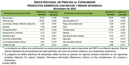 En noviembre de 2022, el Índice Nacional de Precios al Consumidor (INPC) registró una variación de 0.58 % respecto al mes anterior. Con este resultado, la inflación general anual se ubicó en 7.80 por ciento. En el mismo mes de 2021, la inflación mensual fue de 1.14 % y la anual, de 7.37 por ciento.