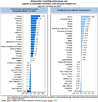 El VAB del sector informal aumentó 3.8 % a tasa anual y representó 54.9 % de la economía informal. Oaxaca, el estado de México, Puebla e Hidalgo fueron las entidades con mayor incremento anual durante el trimestre abril junio de 2023.