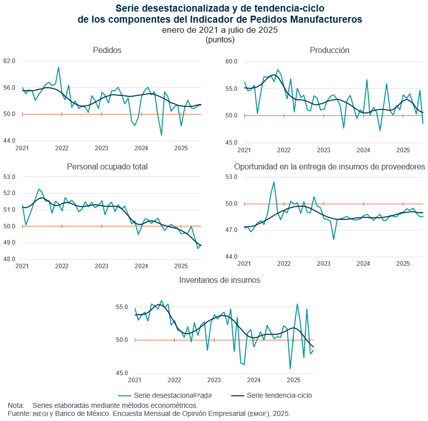 En el séptimo mes de 2025 y con datos sin ajuste estacional, el IPM se ubicó en 49.2 puntos, lo que implicó un aumento anual de 0.7 puntos. En cuanto al desempeño de sus componentes, dos de los cinco rubros que lo conforman registraron incrementos anuales. Los tres restantes descendieron.
