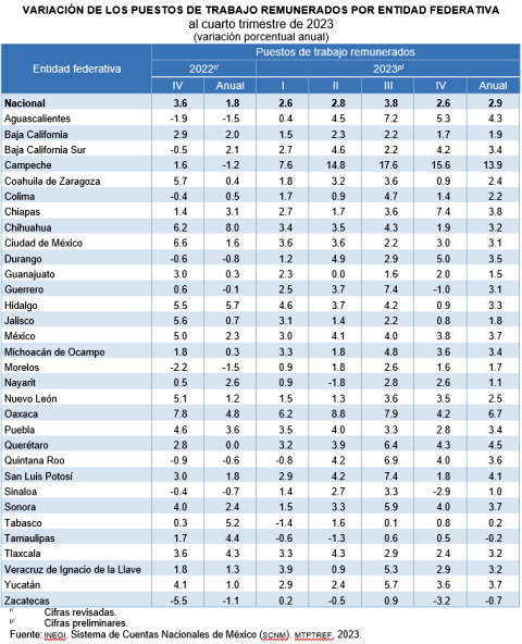 Durante el cuarto trimestre de 2023, el total de puestos de trabajo remunerados de las actividades económicas fue de 41.7 millones, que representó un aumento de 2.6 % en su comparación anual. Las entidades con los mayores incrementos fueron: Campeche (15.6 %), Chiapas (7.4 %), Aguascalientes (5.3 %), Durango (5 %), Querétaro (4.3 %) y, Oaxaca y Baja California Sur (4.2 % cada una).