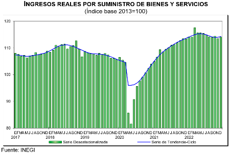 En diciembre de 2022, a tasa mensual y con cifras desestacionalizadas, los resultados de la Encuesta Mensual sobre Empresas Comerciales (EMEC) indican que, en las empresas comerciales al por mayor, los ingresos reales por suministro de bienes y servicios -monto que obtuvieron las empresas por todas aquellas actividades de producción, comercialización o prestación de servicios que realizaron en el mes de referencia-, así como las remuneraciones medias reales pagadas, aumentaron 0.5 por ciento. El personal ocupado total incrementó 0.2 por ciento.