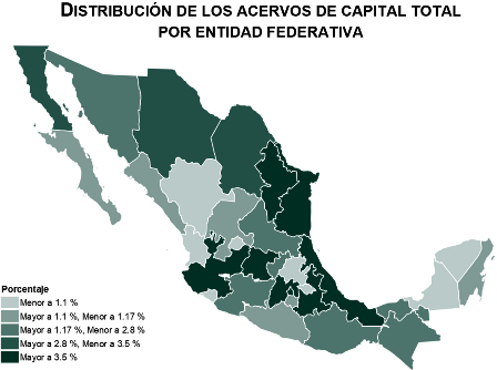 En 2018, los acervos de capital representaron 5.49 veces el valor del PIB. Las entidades con mayor concentración de acervos de capital fueron: Ciudad de México, el estado de México, Jalisco, Veracruz de Ignacio de la Llave, Nuevo León, Tamaulipas, Guanajuato y Puebla, cada una con un rango mayor a 3.5 por ciento. Estos estados concentraron aproximadamente 43 % de las viviendas del país.