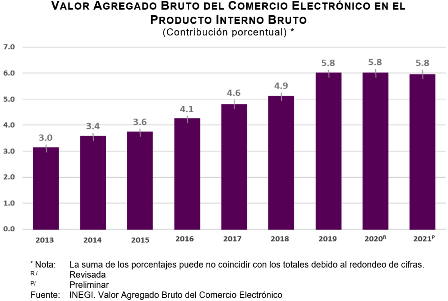 El Instituto Nacional de Estadística y Geografía (INEGI) presenta los resultados preliminares del Valor Agregado Bruto del Comercio Electrónico (VABCOEL) 2021. La medición del VABCOEL da cuenta de la evolución del comercio digital. Este es objeto de estudio para la comunidad estadística y hace frente a los cambios en las mediciones económicas del comercio electrónico.