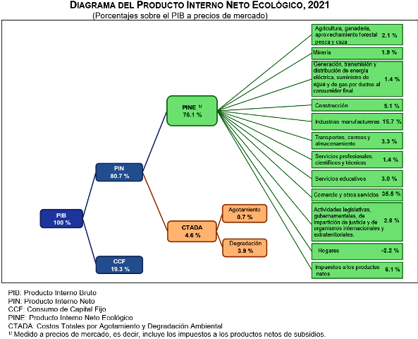 inegi ambiente 2 0112En 2021, el Producto Interno Neto Ajustado Ambientalmente o Producto Interno Neto Ecológico (PINE) -indicador que muestra el impacto ambiental ocasionado por la producción de bienes y servicios-, alcanzó un monto de 19 billones 632 mil 869 millones de pesos y representó 76.1 % del Producto Interno Bruto (PIB), a precios de mercado.