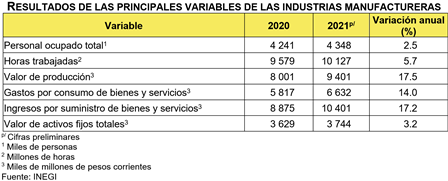 inegi manufactureras 2 0612En 2021, la EAIM presentó variaciones anuales positivas en sus principales variables: personal ocupado total, horas trabajadas, valor de producción, gastos por consumo de bienes y servicios, ingresos por suministro de bienes y servicios y valor de activos fijos totales.