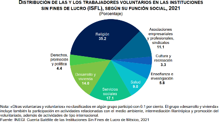 En 2021, las mujeres aportaron 60.6 % del trabajo voluntario relacionado con actividades religiosas. En las actividades de enseñanza e investigación participaron con 53.0 %, en las organizaciones de derechos, promoción y política, su contribución alcanzó 48.4 % y en las instituciones sin fines de lucro (ISFL) dedicadas a la salud, su aportación fue de 41.6 por ciento.