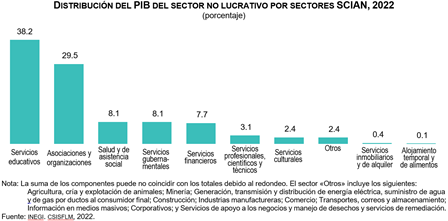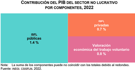 En 2022, el Producto Interno Bruto (PIB) del sector no lucrativo reportó un monto de 823 mil 413  millones de pesos, lo que equivale a 2.9 % del PIB nacional. La cantidad se integra por las actividades de las ISFL públicas -corresponde a la producción «no de mercado» de organismos públicos autónomos-, las relacionadas con los servicios que prestan las ISFL privadas -generación de servicios para los hogares que realizan las organizaciones como las Asociaciones Civiles e Instituciones de Asistencia Privada, entre otras-,  y la valoración económica del trabajo voluntario -se refiere a la ampliación de la frontera de la producción para valorar de manera económica las horas que aportan las personas voluntarias en la generación de servicios colectivos-.
