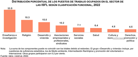 En 2022, las actividades del sector de las ISFL requirieron de la participación de 2 millones 860 mil 425 puestos de trabajo ocupados, lo que equivale a 7.3 % del total nacional. En 2021, el total de puestos de trabajo empleados en el sector fue de 2 millones 668 mil 819, por lo que se puede observar un aumento de 7.2 por ciento.