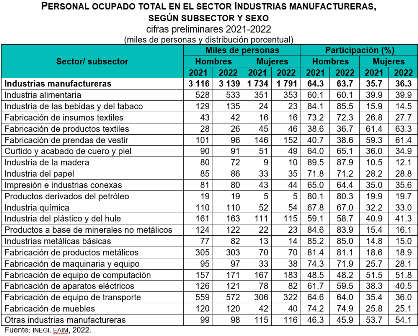 En 2022, los subsectores de Industrias manufactureras con mayor participación de las mujeres dentro del personal ocupado total fueron: Fabricación de producto textiles, con 63.3 %; Fabricación de prendas de vestir, con 61.4 %; Otras industrias manufactureras, con 54.1 %; Fabricación de equipo de computación, con 51.8 % e Industria del plástico y del hule, con 41.3 por ciento.