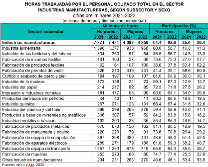 Para las horas trabajadas, los subsectores en los que la presencia de hombres fue mayor son: Industria de la madera, Industria de las bebidas y del tabaco, Industrias metálicas básicas, Productos a base de minerales no metálicos, Fabricación de productos metálicos y Productos derivados del petróleo. En estos subsectores, el porcentaje de horas trabajadas por los hombres superó 80.0 % en relación con las horas trabajadas por el personal ocupado total de cada industria. Asimismo, los subsectores que tuvieron mayor participación de las horas trabajadas por las mujeres con respecto a las horas trabajadas por el personal ocupado total fueron: Fabricación de productos textiles, con 62.2 %; Fabricación de prendas de vestir, con 60.9 %; Otras Industrias manufactureras, con 53.9 %; Fabricación de equipo de computación, con 52.0 % e Industria alimentaria, con 41.3 por ciento.