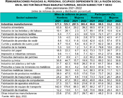 Los cinco subsectores con mayor participación de las remuneraciones pagadas a las mujeres, respecto a las remuneraciones totales pagadas al personal ocupado dependiente de la razón social, fueron: Fabricación de prendas de vestir, con 57.5 %; Otras industrias manufactureras, con 51.8 %; Fabricación de equipo de computación, con 50.6 %; Fabricación de productos textiles, con 41.7 % y Fabricación de aparatos eléctricos, 39.0 por ciento.