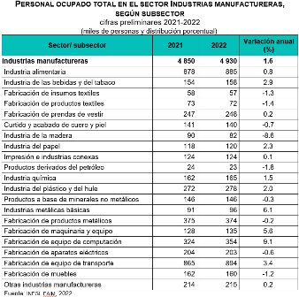 Los cinco subsectores con más personal ocupado en 2022 fueron: Fabricación de equipo de transporte, Industria alimentaria, Fabricación de productos metálicos, Fabricación de equipo de computación e Industria del plástico y del hule.