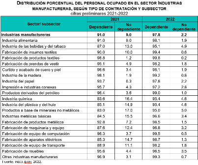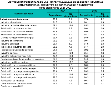En 2022, los subsectores con mayor participación del personal dependiente de la razón social en las horas trabajadas fueron: Fabricación de productos textiles, con 99.8 %; Fabricación de equipo de computación, con 99.5 %; Fabricación de insumos textiles, con 99.4 %; Otras industrias manufactureras, con 99.3 % y Productos derivados del petróleo, con 99.2 por ciento. Por su parte, los subsectores en los que el personal no dependiente de la razón social presentó mayor participación en las horas trabajadas fueron: Productos a base de minerales no metálicos, con 5.5 %; Industria química, con 4.6 %; Industria del plástico y del hule e Industria de las bebidas y del tabaco, ambas con 4.5 % y Fabricación de muebles, con 3.7 %.