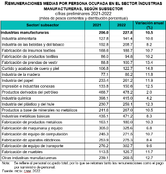 Las remuneraciones medias por persona ocupada en Industrias manufactureras presentaron niveles de 206 mil y 227.8 mil pesos corrientes en 2021 y 2022, respectivamente. Así, se observa un incremento de 10.5 % a tasa anual.