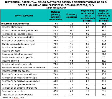 Los subsectores en los que las materias primas y auxiliares consumidas tuvieron una mayor participación respecto al total de gastos por consumo de bienes y servicios fueron: Productos derivados del petróleo, con 92.3 %; Fabricación de equipo de transporte, con 89.1 %; Fabricación de aparatos eléctricos, con 85.4 %; Industrias metálicas básicas, con 84.6 % e Industria de la madera, con 83.1 %.