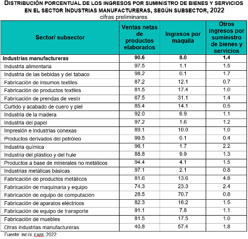 Los subsectores con mayor participación de los ingresos por maquila fueron: Fabricación de equipo de computación, con 70.7 %; Otras industrias manufactureras, con 57.4 %; Fabricación de prendas de vestir, con 31.1 %; Fabricación de maquinaria y equipo, con 23.3 % y Fabricación de muebles, con 17.5 %.