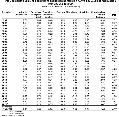 En 2022, la medición de la PTF para el total de la economía mexicana registró un crecimiento de 1.30 %, en comparación con 2021. Lo anterior, como consecuencia de una tasa de 5.17 % del valor de la producción y 3.87 % de la contribución total de los factores.
