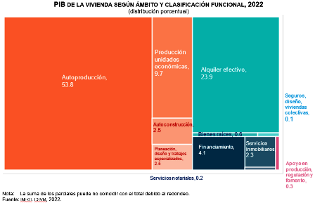 Al considerar la clasificación funcional -integra las recomendaciones del Sistema de Cuentas Nacionales (SCN) en su versión 2008 y los acuerdos del Grupo Técnico de Trabajo de Vivienda-, propia del sector de la vivienda, se observa que las actividades que más aportaron a este PIB fueron: la autoproducción, que participó con 53.8 %; la producción de unidades económicas, con 9.7 %; el alquiler efectivo, con