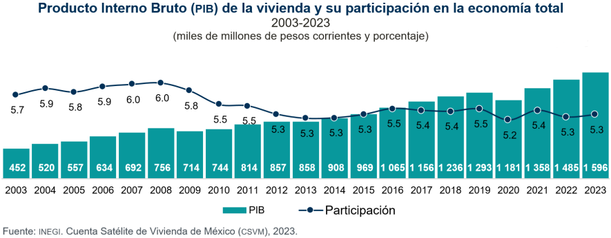 En 2023, de acuerdo con la CSVM, el sector de la vivienda generó un Producto Interno Bruto (PIB) de un billón 596 mil 333 millones de pesos corrientes, cantidad que equivale a 5.3 % del PIB del total de la economía y que fue aportado por 84 actividades económicas. Esta cifra es similar a la que se tuvo en 2022 y ligeramente mayor a la presentada en 2020, primer año de pandemia por COVID-19 en el país.