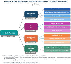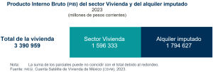 Al considerar el valor del alquiler imputado y el valor del sector vivienda, en 2023, el PIB total de esta actividad alcanzó un monto de 3 billones 390 mil 959 millones de pesos a precios corrientes. Esta cantidad representó 11.3 % del PIB del total de la economía.